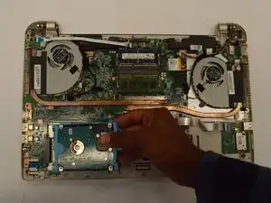 После того как жёсткий диск немного приподнят, убедитесь, что ноутбук ориентирован правильно, аккумулятор должен быть от вас, и потяните жёсткий диск вправо.