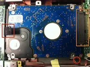 Осторожно приподнимите жёсткий диск за чёрную вкладку слева и сдвиньте влево, чтобы освободить его от разъёма справа. После этого жёсткий диск можно вынуть.