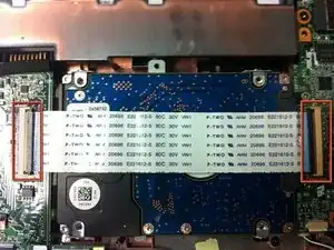 Через жёсткий диск проходит кабель, соединяющий две основные платы. Как и с тачпадом, он снимается подъёмом двух чёрных фиксаторов и выдвижением кабеля.