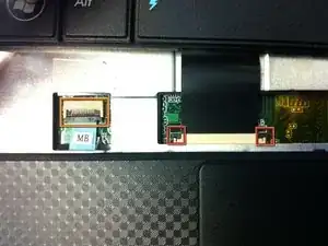Чтобы отключить тачпад, поднимите чёрную планку. На ней приклеена прозрачная метка с надписью MB. Используйте её, чтобы вытащить кабель с платы. Сопротивления быть не должно.
