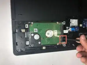 Используйте пластиковую лопатку, чтобы снять проводящую ленту жёсткого диска: поднимите чёрную защёлку, удерживающую ленту, затем потяните проводящую ленту влево, чтобы снять её.