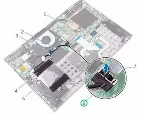 Отклейте ленту, фиксирующую кабель жёсткого диска к подставке для ладони и узлу клавиатуры.