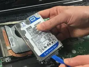 Поднимите жёсткий диск и снимите разъём на конце с помощью синего инструмента для поддевания.