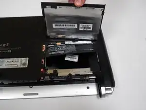 С помощью пластикового инструмента для вскрытия снимите крупную квадратную крышку на правой нижней стороне ноутбука.
