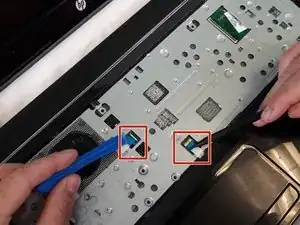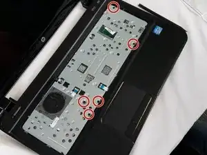Снимите два винта Phillips #1 длиной 6,5 мм, крепящие клавиатуру, на нижней стороне ноутбука.