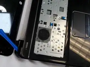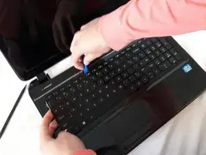 Протолкните отвёртку через отверстие под винт, чтобы приподнять клавиатуру.