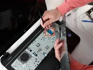 Отсоедините провод клавиатуры, подняв защёлку под синим пластиком.