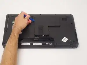 Подденьте пластиковой лопаткой между задней крышкой и панелью жёсткого диска/оперативной памяти вблизи винта.