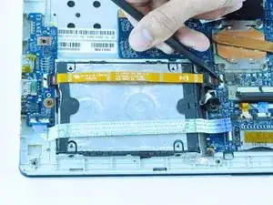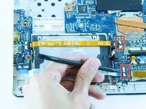Используйте острый конец лопатки, чтобы приподнять защёлки, удерживающие две ленточные шлейфы на материнской плате.