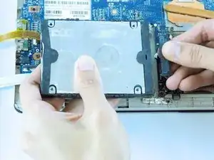 Используйте инструмент для открытия или пальцы, чтобы приподнять жёсткий диск и вынуть его из ноутбука.
