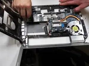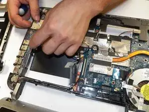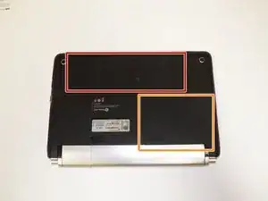 Снимите две пластиковые накладки, закрывающие внутренние компоненты ноутбука.