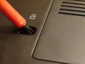 Найдите винт Phillips №1 длиной 4 мм рядом с изображением белого замка, который удерживает DVD-привод на месте.