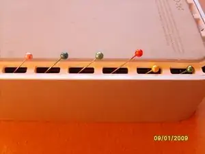 Вставьте штырьки из соседних отверстий между стенкой и каждой защелкой. Будьте очень осторожны, чтобы штырьки находились вплотную к стенке корпуса. Это более очевидно на втором фото с удаленным корпусом.