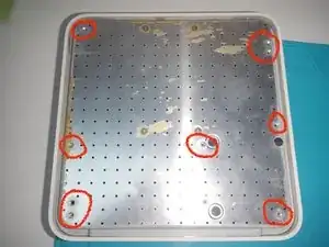 Удалите 7 отмеченных винтов, чтобы снять алюминиевое дно и разобрать плату блока питания.