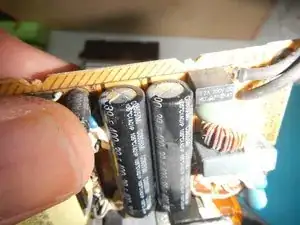 Действуя медленно, вам необходимо открыть плату блока питания (скотчи будут возвращены на место после того, как вы закончите с ними), затем выпаять старые конденсаторы (всегда меняйте оба, даже если неисправен только один), припаять новые и собрать обратно.