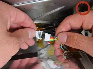 Следующий шнур, который нужно отключить между двумя панелями дисплея, — это кабель инвертора. Он находится под инвертором ближе к нижней части экрана и имеет только два провода, подключающихся к меньшему белому разъёму.