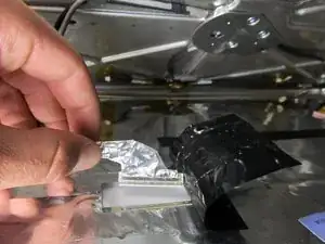 Под чёрной лентой вы увидите, как серый и чёрный провода входят в разъём, похожий на завернутый в алюминиевую фольгу. Захватите этот разъём и аккуратно потяните вниз, в направлении нижней части дисплея.
