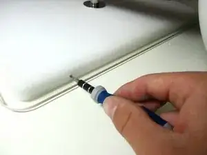Расположите компьютер так, чтобы все три винта на нижней стороне дисплея были доступны. Это может быть вертикально или лежа лицевой стороной вниз на мягкой поверхности.