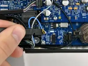 Используйте плоский конец лопатки, чтобы поддеть разъём антенны Bluetooth и отсоединить его от платы Bluetooth.
