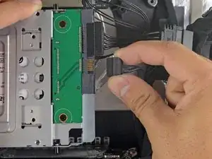 Кабель вертикальной синхронизации имеет контакт в стиле ZIF, но разъём не имеет фиксатора или защёлки. Просто потяните кабель прочь от разъёма в сторону оптического привода, чтобы отключить его от платы драйвера светодиодов.