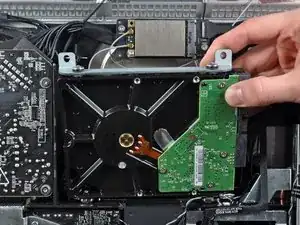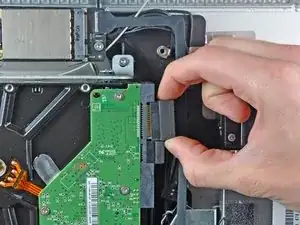 Небольшим поворотом выведите жесткий диск из наружного корпуса и поднимите его с посадочных штифтов в сторону верхнего края iMac.