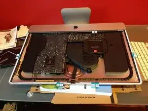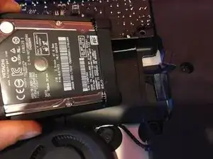 Извините, нет фотографий процесса открытия машины, но это довольно просто. Используйте инструмент ifixit и пройдитесь им по краям. Как только сможете прокатывать его по краю без сопротивления, медленно начните приподнимать экран — здесь я использовал медиатор. Отсоедините два кабеля дисплея от экрана. Вот тот самый жёсткий диск, который мы так хотим заменить.