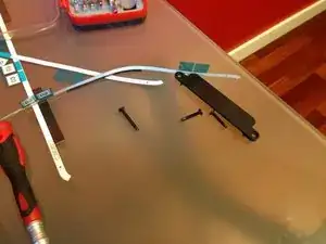 Далее начните удалять старую клейкую ленту — это проходит очень легко из‑за возраста клея. Через пять лет ситуация может быть другой. Я использовал маленький инструмент ifixit, чтобы начать отлеплять полосы. Помните, вы разрезали ленту, поэтому нужно отлепить её и от корпуса компьютера, и от экрана. Занимает около 10 минут...