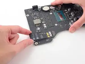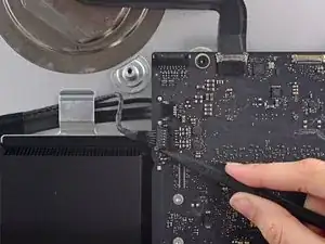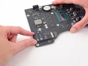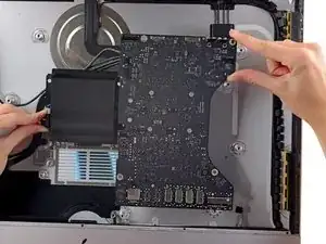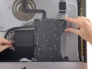 Поднимите плату логики вертикально и извлеките её из iMac.