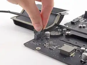 Сожмите защёлку на задней стороне разъёма кабеля постоянного тока и потяните его прямо из гнезда на задней стороне логической платы.