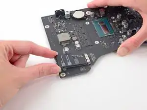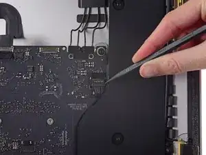 Снимите два винта T5 длиной 3,2 мм, закрепляющие карту AirPort/Bluetooth на плате логики.