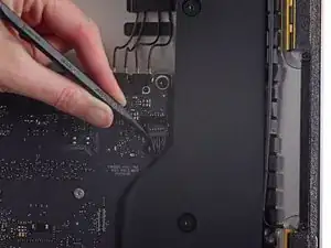 Используйте пинцет, чтобы откинуть металлический фиксатор разъёма кабеля данных дисплея.
