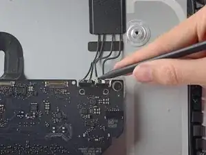 Не пытайтесь полностью извлечь блок питания из iMac сейчас — он всё ещё подключён к логической плате.