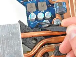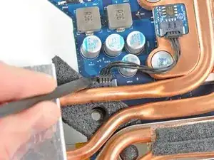 Потяните разъём вентилятора ЦП в сторону левого края iMac, чтобы отключить его от логической платы.