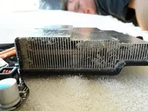 Эти тепловые трубки ведут к рёбрам над основным вентилятором. Вот как выглядит четыре года накопившейся пыли. Неужели это причина гибели моего VRAM?