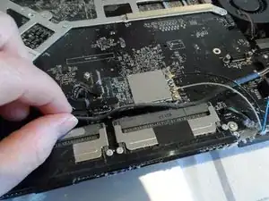 Почти готово! Пришло время по-настоящему перейти на беспроводное соединение — отключите три антенны Wi‑Fi и Bluetooth. Это крошечные защёлки, тяните аккуратно вверх. Также, пробираясь снизу, вы найдёте кабель камеры iSight. Отключите его. На это стоит обратить внимание при повторной установке логической платы.