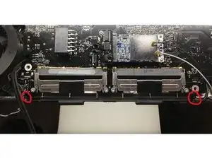 Удалите два винта T-9 (2 мм x 7 мм) из нижнего правого и левого углов слотов оперативной памяти, которые фиксируют чёрную пластиковую скобу к раме.