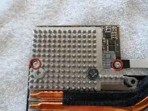Видеокарта крепится двумя винтами Torx T-9 (2 мм x 5 мм) на плате GPU...