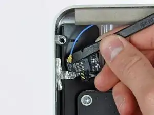 На некоторых iMac это может быть не ленточный кабель, а четыре отдельных очень тонких и очень хрупких провода. Будьте очень осторожны: если пинцет соскользнёт с разъёма, вы с большой вероятностью вырвёте провод из сборки.