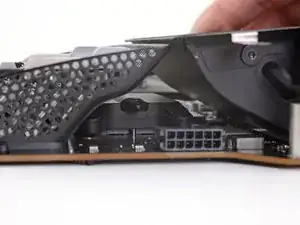Начиная с левой стороны дисплея, рядом с кнопкой питания, вставьте инструмент для открытия iMac в зазор между стеклянной панелью и задней крышкой.