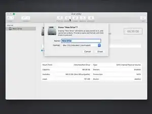 Придумайте имя для диска и убедитесь, что формат установлен на Mac OS Extended (журнальный) или APFS. Если есть опция «Схема», установите GUID Partition Map.