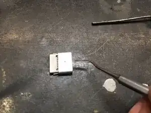 Возьмите металлический стержень диаметром 4-5 мм и выдавите внутреннюю часть разъема через отверстие провода.