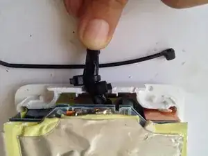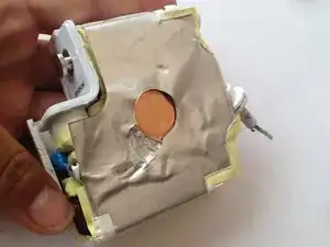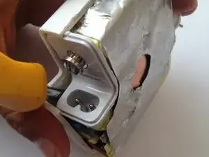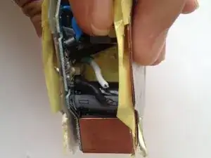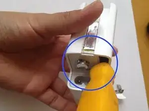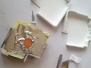 Вставьте отвёртку в верхнюю часть зарядного и аккуратно отделяйте фольгу от пластикового корпуса. Следите, чтобы не оторвать фольгу от внутренней части зарядного.