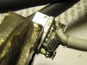 Установите обратно усилитель натяжения. Он должен располагаться под двумя язычками на печатной плате над точками пайки для оплётки и центральной жилы.