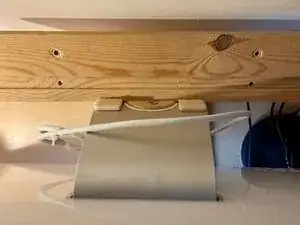 Чтобы всё выглядело аккуратно, и поскольку у меня была отдельная клавиатура и Magic Mouse, я также захотел закрепить MacBook сзади — я сделал настенное крепление из дерева в стиле AluRack, прикрепив его к отверстию для кабеля на подставке iMac — идеально!