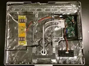 Чтобы обеспечить правильное расположение стойок, я вырезал квадраты в ЭМИ-экранировке перед приклеиванием стоек к внутренней стороне корпуса iMac. Я также просверлил отверстия для платы питания/регулировки, чтобы кнопки были доступны с задней стороны корпуса.