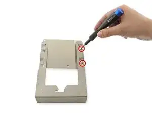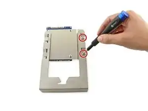Закрутите три винта PH0 длиной 6.1 мм в скобу и жёсткий диск.
