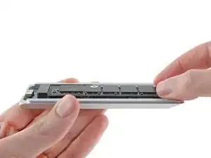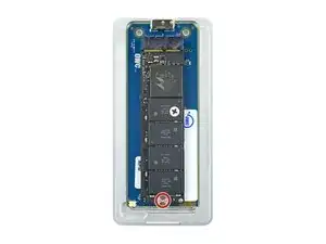 Когда SSD полностью вставлен, вы должны едва видеть золотые контактные точки на верхней части устройства, а выемка в нижней части устройства должна быть выровнена с отверстием для винта в корпусе.