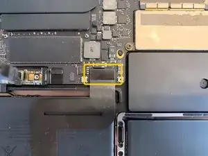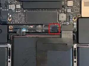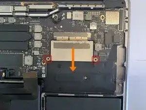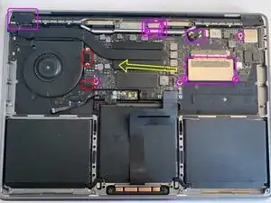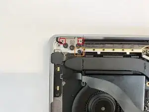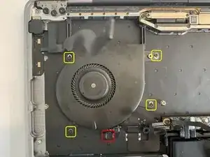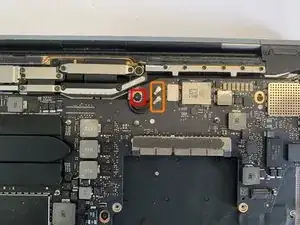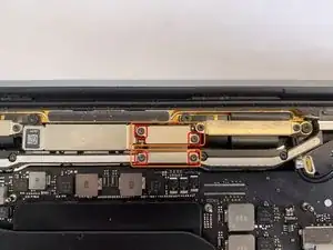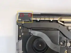 Выкрутите один винт T5, который крепит разъём аккумулятора к ноутбуку.