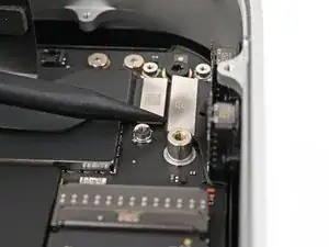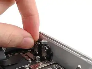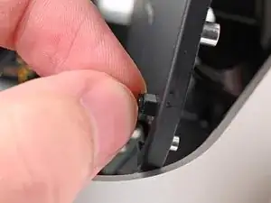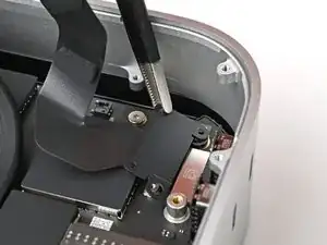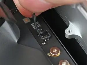 Легко захватите индикатор питания пинцетом и оттяните его от шасси, чтобы отделить клей, фиксирующий его кабель.