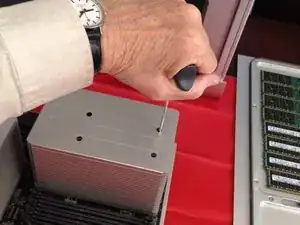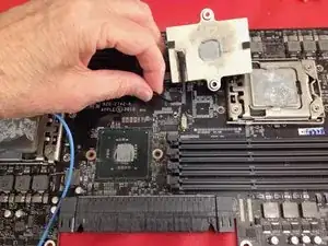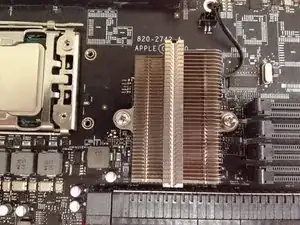 Ремонт обычно включает два узла, которые являются известными слабыми местами в Mac Pro 5,1. Радиатор северного моста крепится пружинными пластиковыми держателями. Держатели подвергаются высоким температурам и через несколько лет становятся хрупкими и часто ломаются. Этим машинам более десяти лет, поэтому можно с уверенностью предположить, что пластиковые держатели либо уже сломаны, либо скоро сломаются. Если они отломаются и радиатор отойдёт от поверхности чипа, чип перегреется, выйдет из строя и повлечёт за собой плату процессора. Их необходимо заменить!